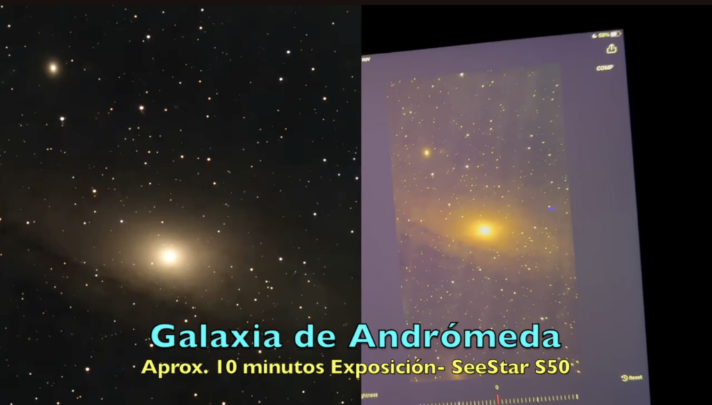 The main advantage is with deep space objects. The Andromeda Galaxy, which in a visual telescope looks like a blurry patch, with the SeeStar S50 accumulating exposure for 10 minutes starts showing its structure and different tones in the nucleus. The Orion Nebula is seen with real colors and details that no eye can capture directly.